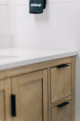 I love the dark cabinets in the kitchen in this one! They warm up all the white and have ample space for storage and cooking. We snuck in a sweet shelf for a little decor and I love how hard this space works while still being a looker.